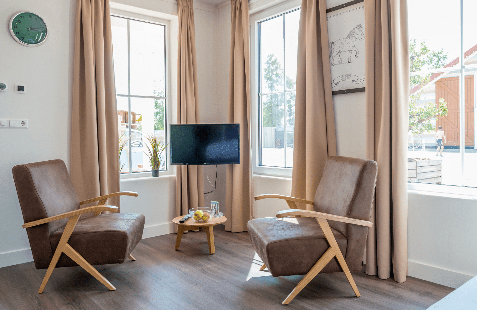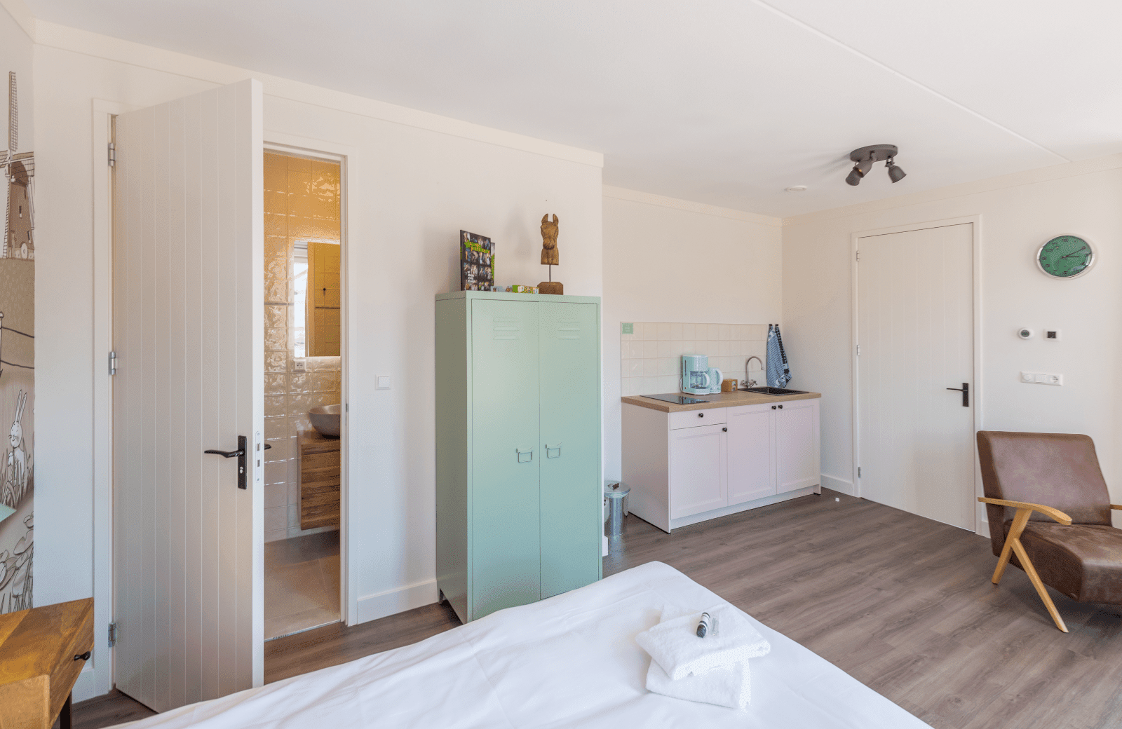De Stip de Pony studio’s bevinden zich op de hoeken van de rijtje aaneengeschakelde accommodaties en beschikken over een gezellig zitje, een tweepersoons boxspring, een babybed en een badkamer met douche, wastafel en toilet.
