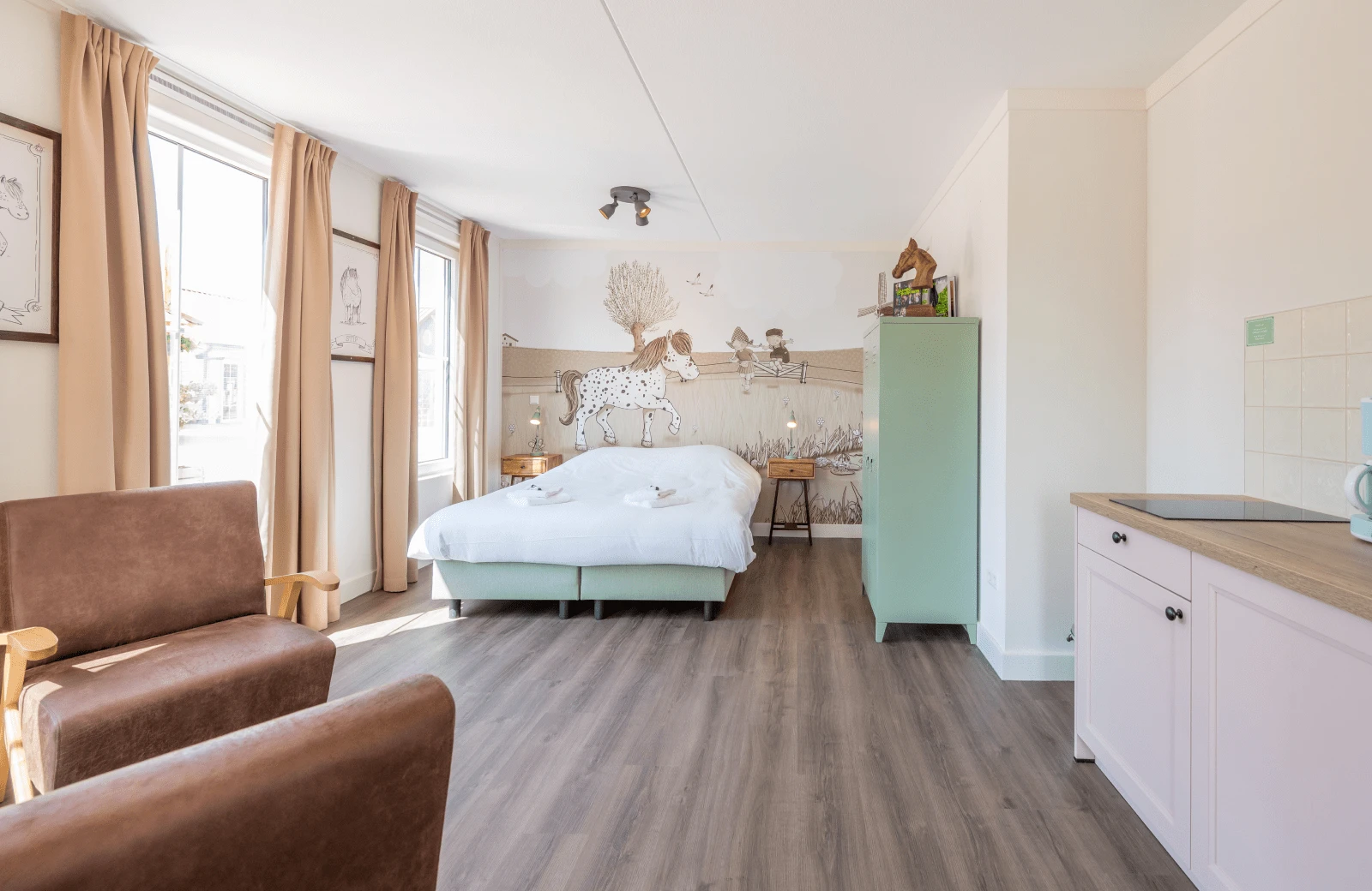 De Stip de Pony studio’s zijn onderdeel van een rijtje aaneengeschakelde accommodaties. De studio’s bestaan uit één ruimte en zijn een perfecte uitvalsbasis voor een vakantie met een klein gezelschap. De inrichting van de studio’s is geheel in Stip de Pony stijl. Je vindt er van alles terug over de ondeugende Stip de Pony. Deze Stip de Pony Studio's met babybed bevinden zich op de eerste verdieping.