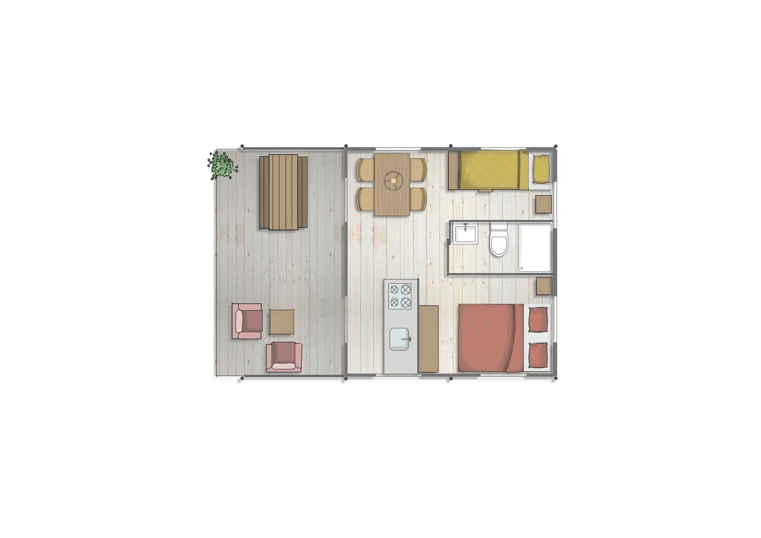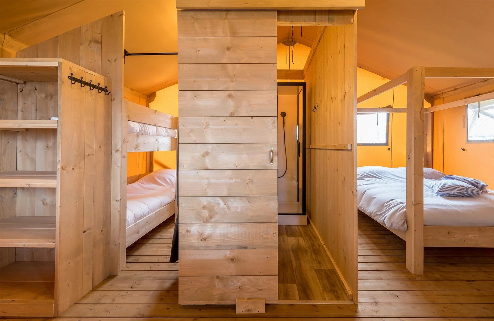 Deze bijzondere Avonturentent beschikt over een leefruimte met eethoek en een grote veranda met zithoek. De keuken is voorzien van onder andere een kookplaat en koelkast. Vind jouw welverdiende nachtrust in de twee ruime slaapkamers met comfortabele boxsprings. Ook is de Avonturentent voorzien van een badkamer met douche en toilet.