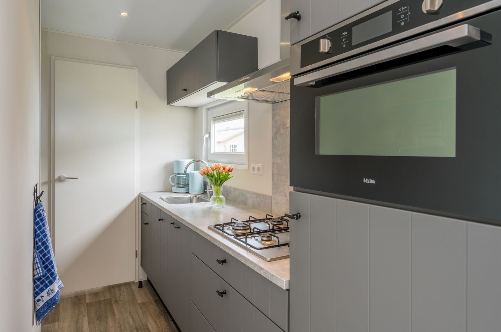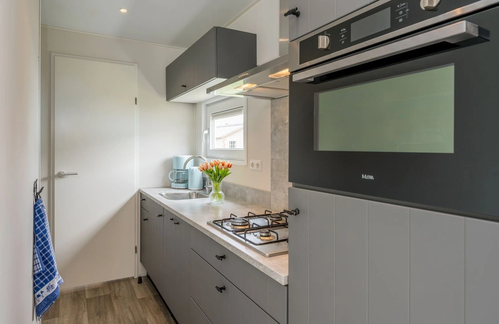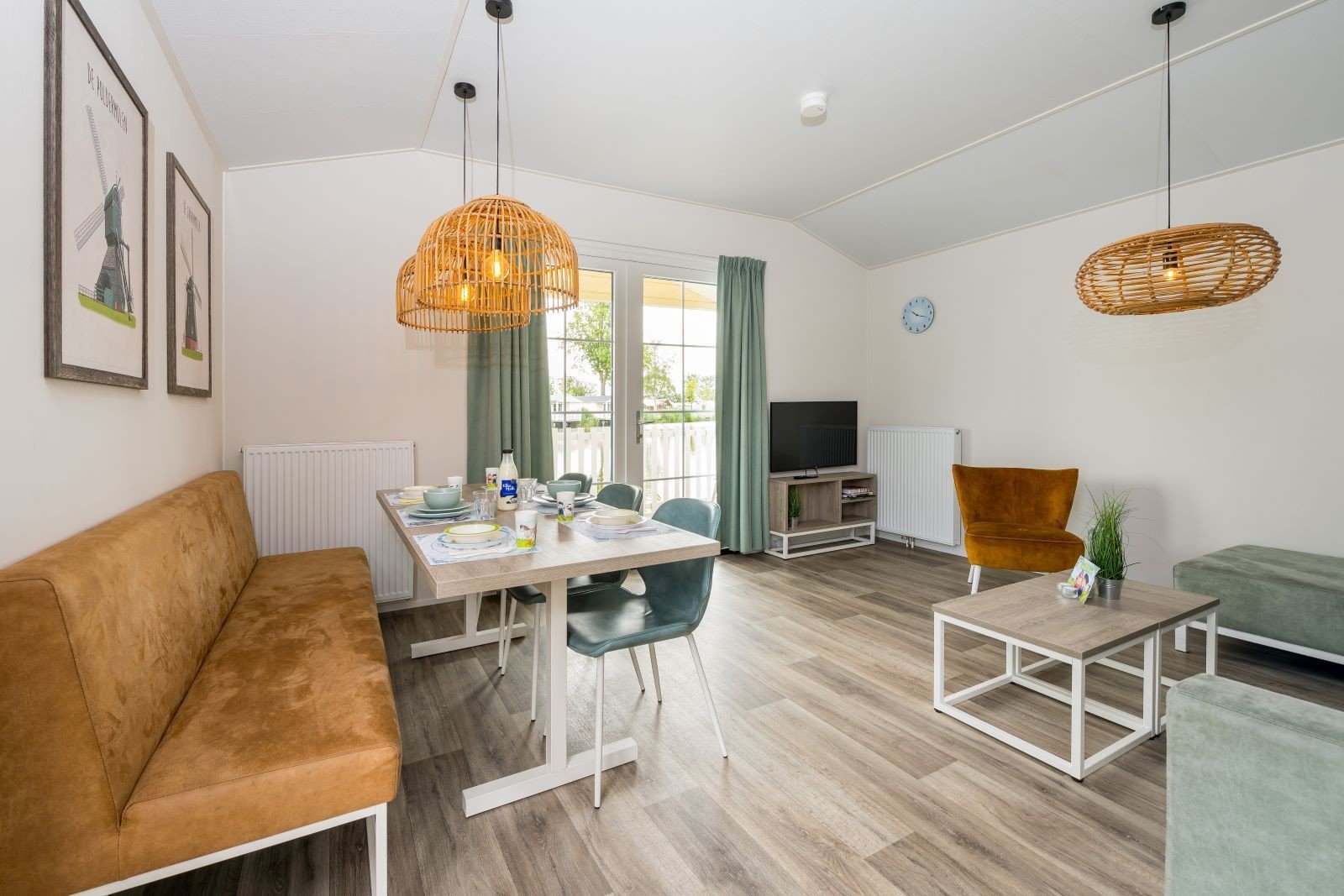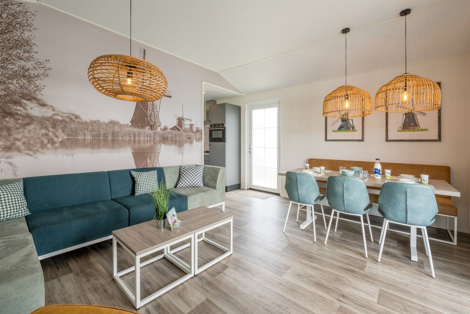 Deze pastelkleurige, vrijstaande Kinderdijk Cottage beschikt over een sfeervolle woonkamer met zit- en eethoek. De keuken is voorzien van onder andere een kookplaat, koelkast, vaatwasser en combimagnetron.
