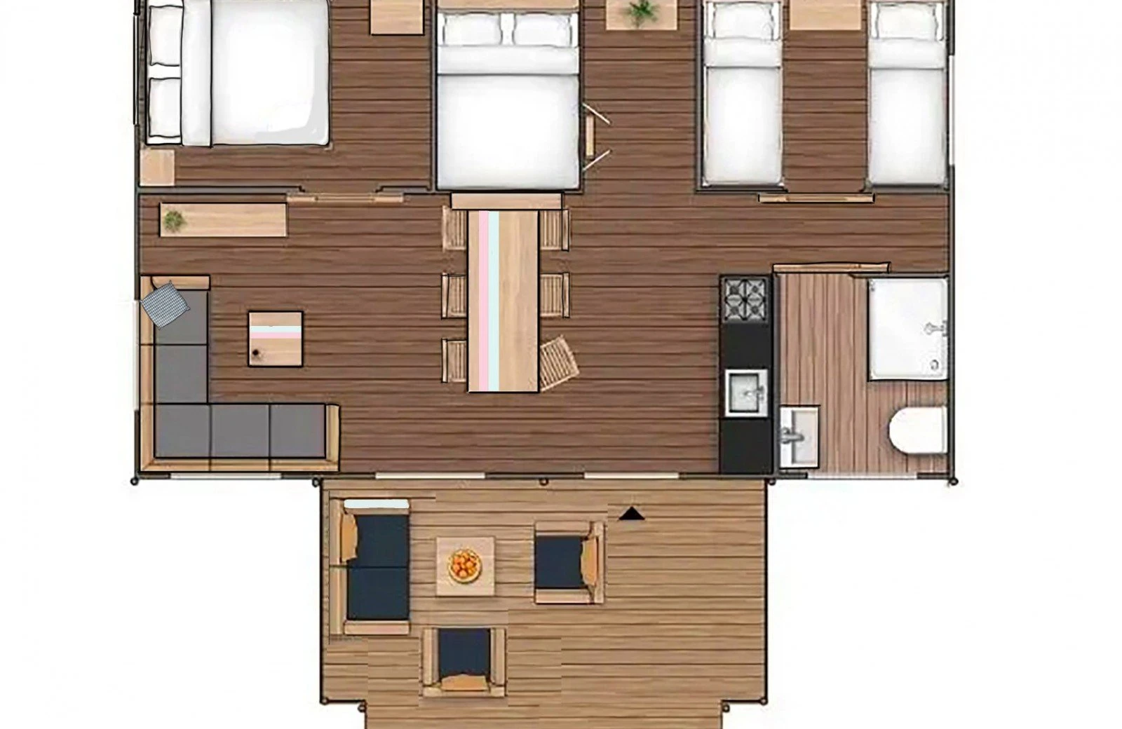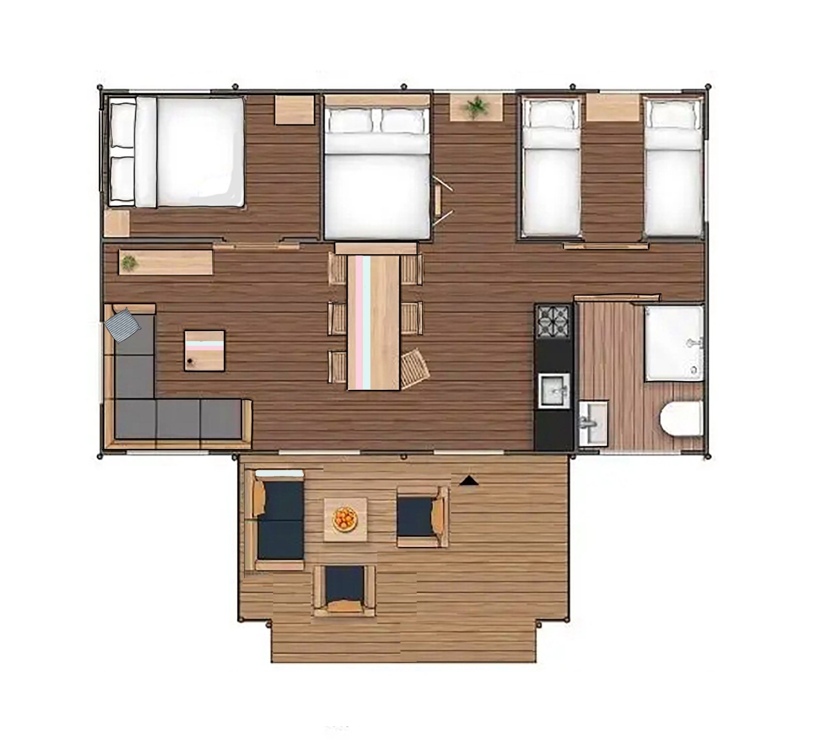 Ervaar de luxe van een huisje én het plezier van kamperen, in de sfeervolle Avonturentent. Door het overdekte terras loopt de buitenruimte naadloos over in de binnenruimte. Zo geniet je samen van dat heerlijke vrije kampeergevoel, met extra comfort.
