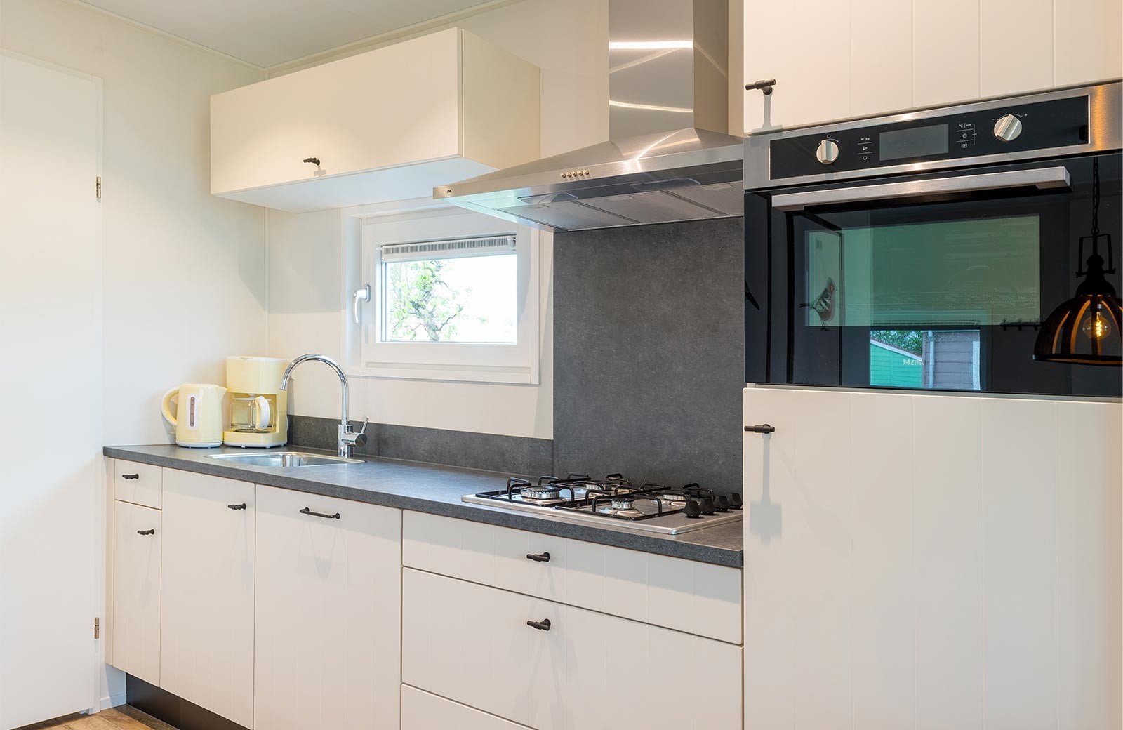 Dit vrijstaande Biesboschchalet, ingericht in moderne stijl, beschikt over een gezellige woonkamer met zit- en eethoek. De keuken is voorzien van onder andere een kookplaat, koffiezetapparaat, waterkoker, koelkast, vaatwasser en magnetron.