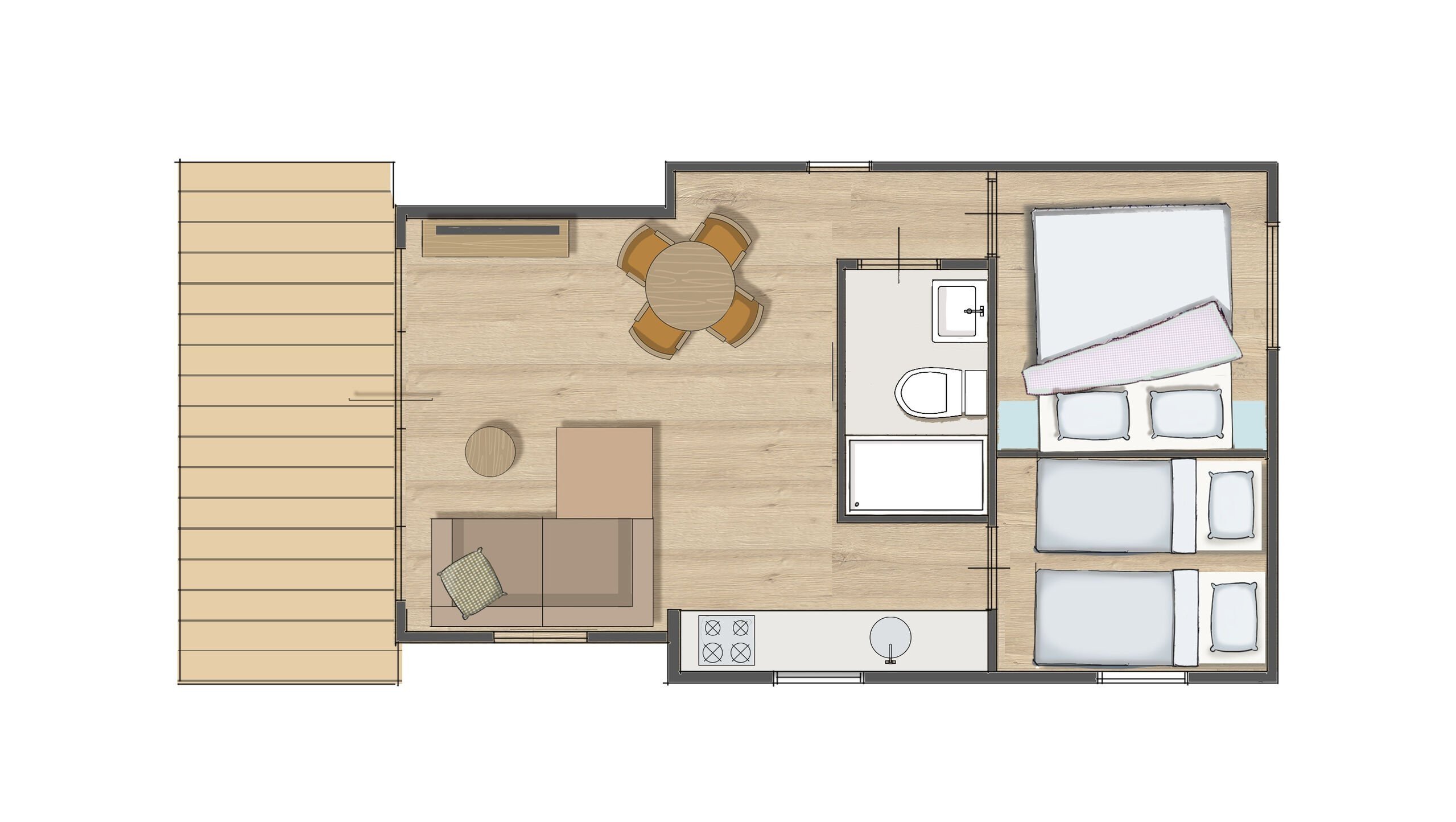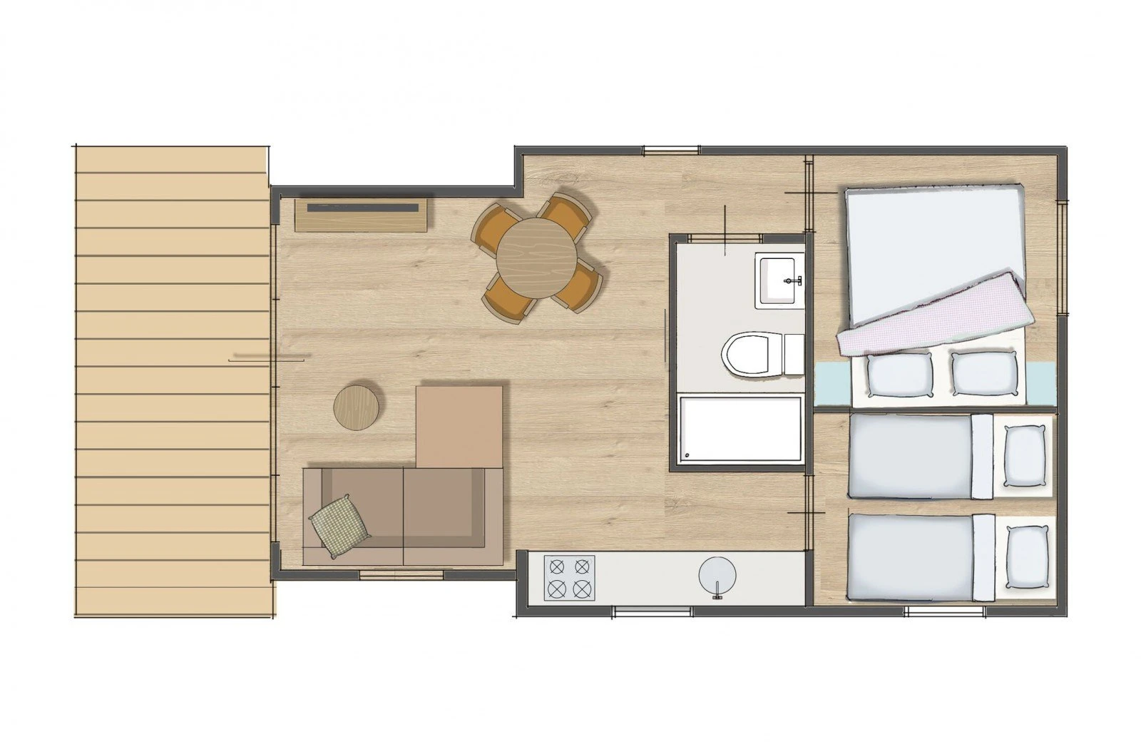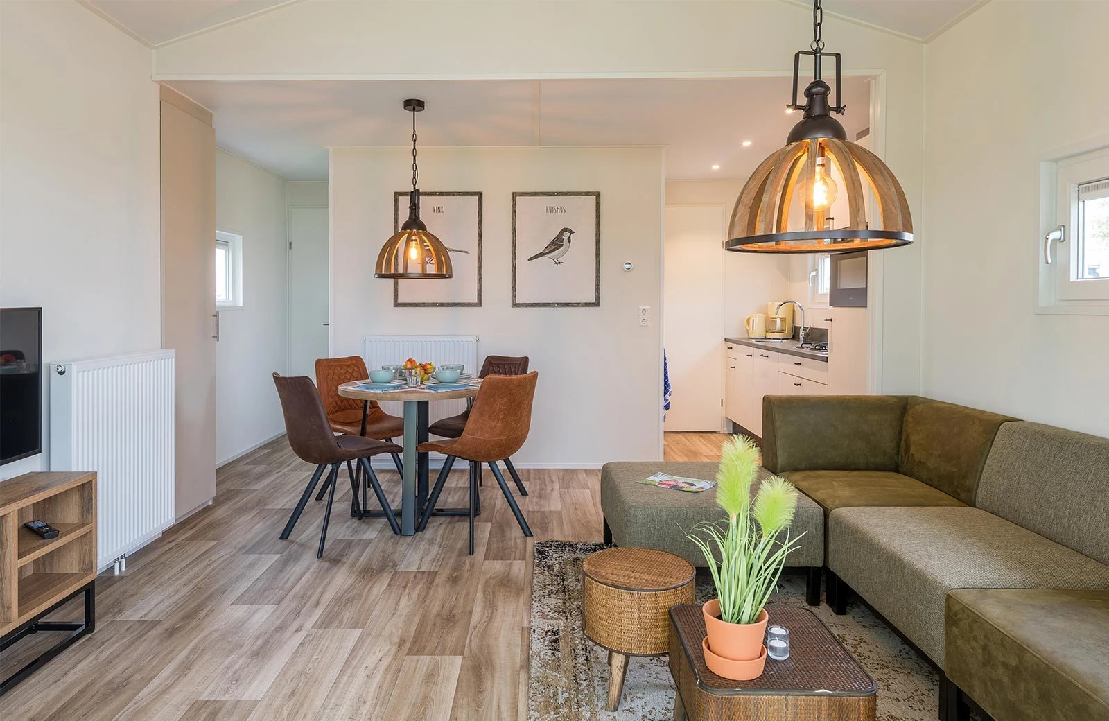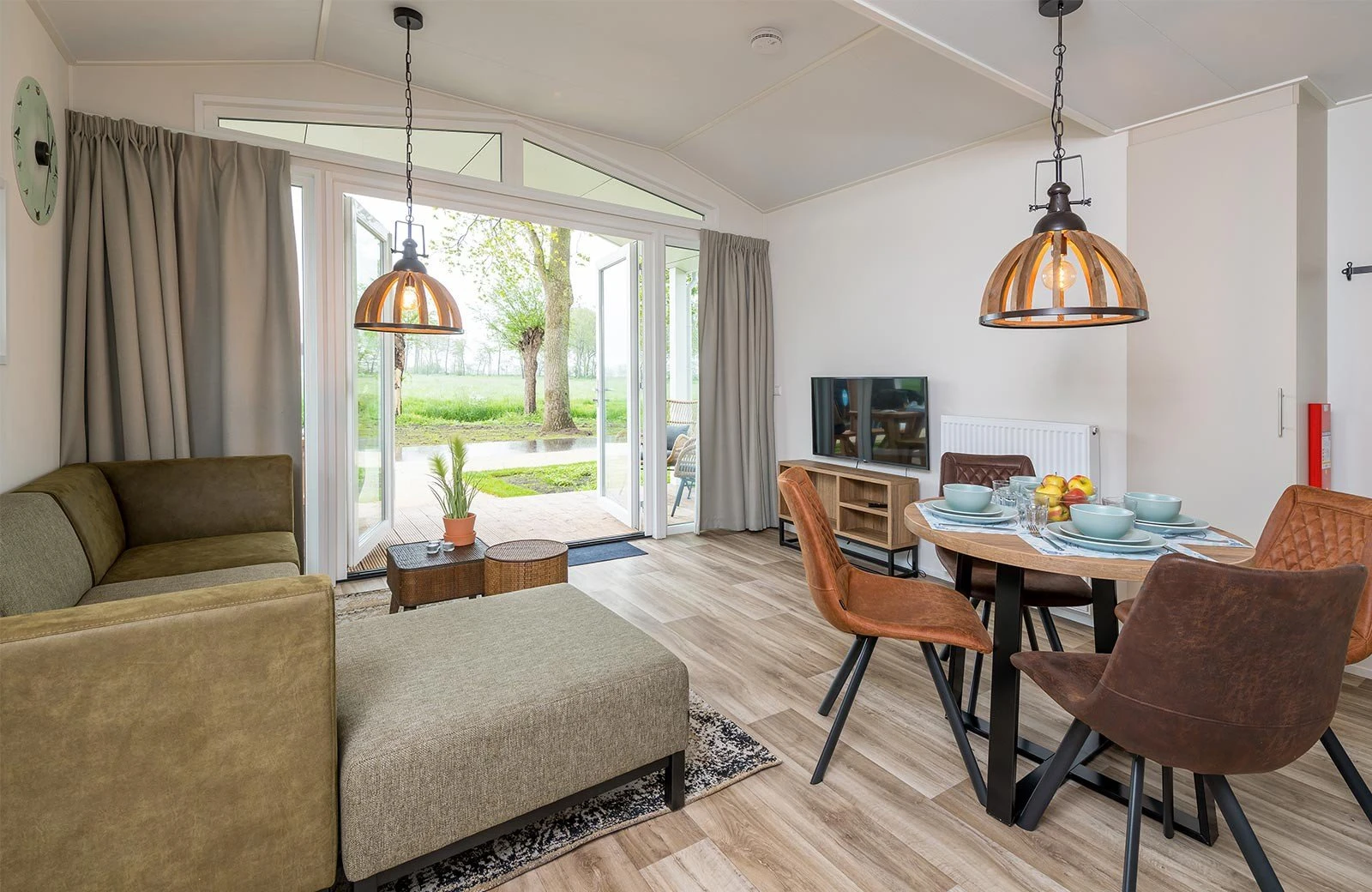 Geniet van de polderse rust, in het huiselijke Biesboschchalet. Plof neer in de stoelen op de overdekte veranda, en ervaar het prachtige uitzicht over het park.