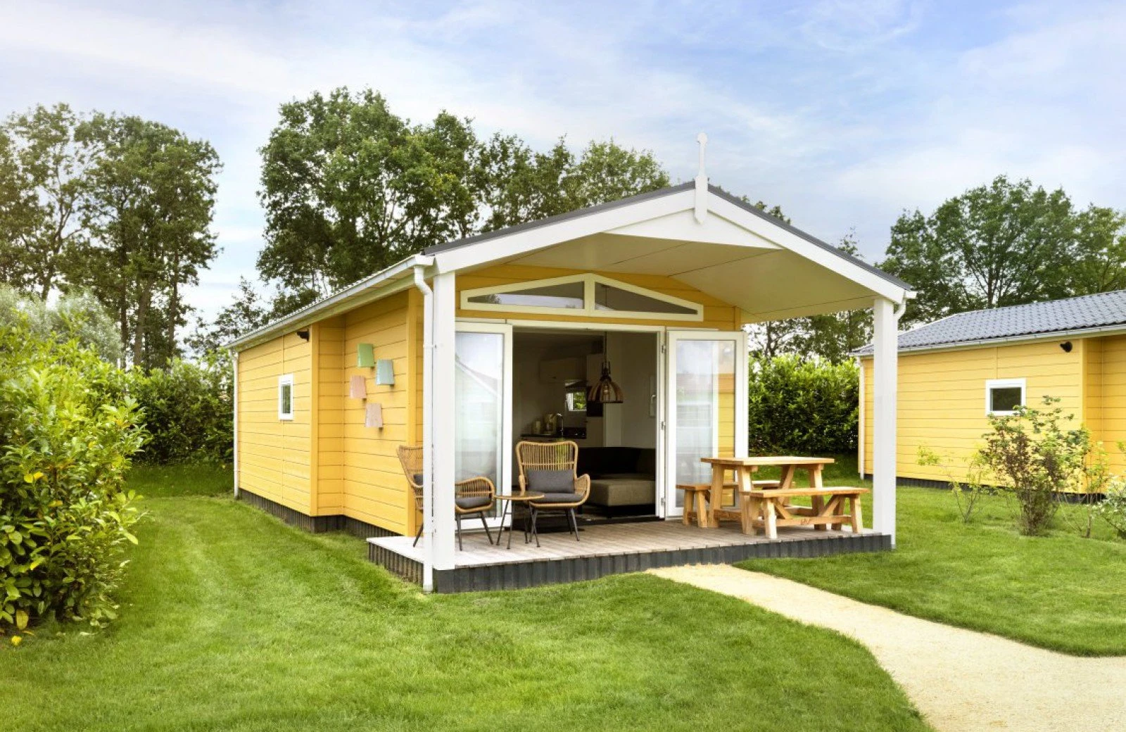 Geniet van de polderse rust, in het huiselijke Biesboschchalet. Plof neer in de stoelen op de overdekte veranda, en ervaar het prachtige uitzicht over het park.