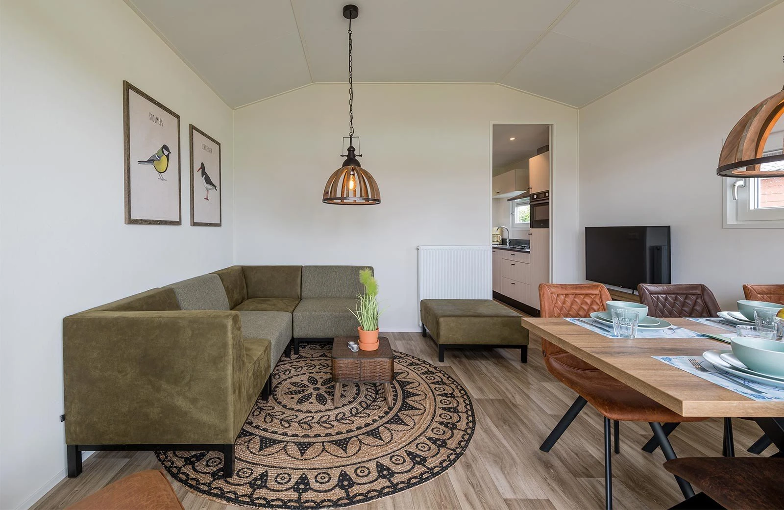 Dit vrijstaande Biesboschchalet, ingericht in moderne stijl, beschikt over een gezellige woonkamer met zit- en eethoek. De keuken is voorzien van onder andere een kookplaat, koffiezetapparaat, waterkoker, koelkast, vaatwasser en magnetron.