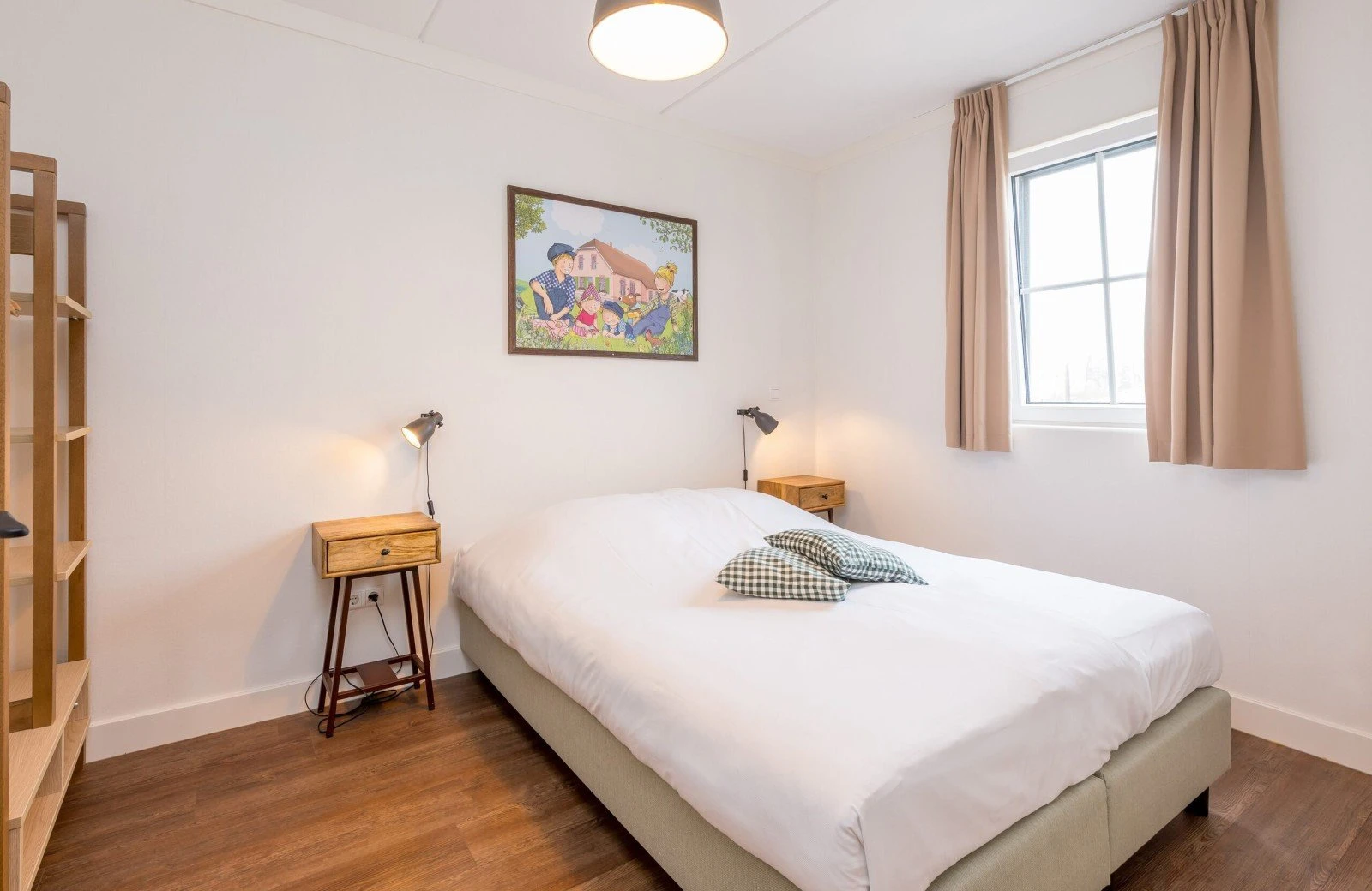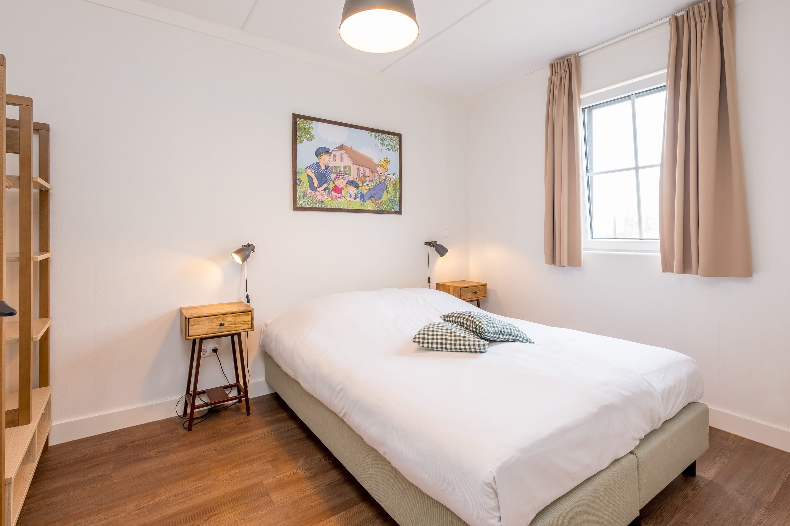 Overdag kan je genieten van de buitenlucht op jouw eigen half omheinde, overdekte terras met uitzicht op een speeltuintje en de schapenweide.