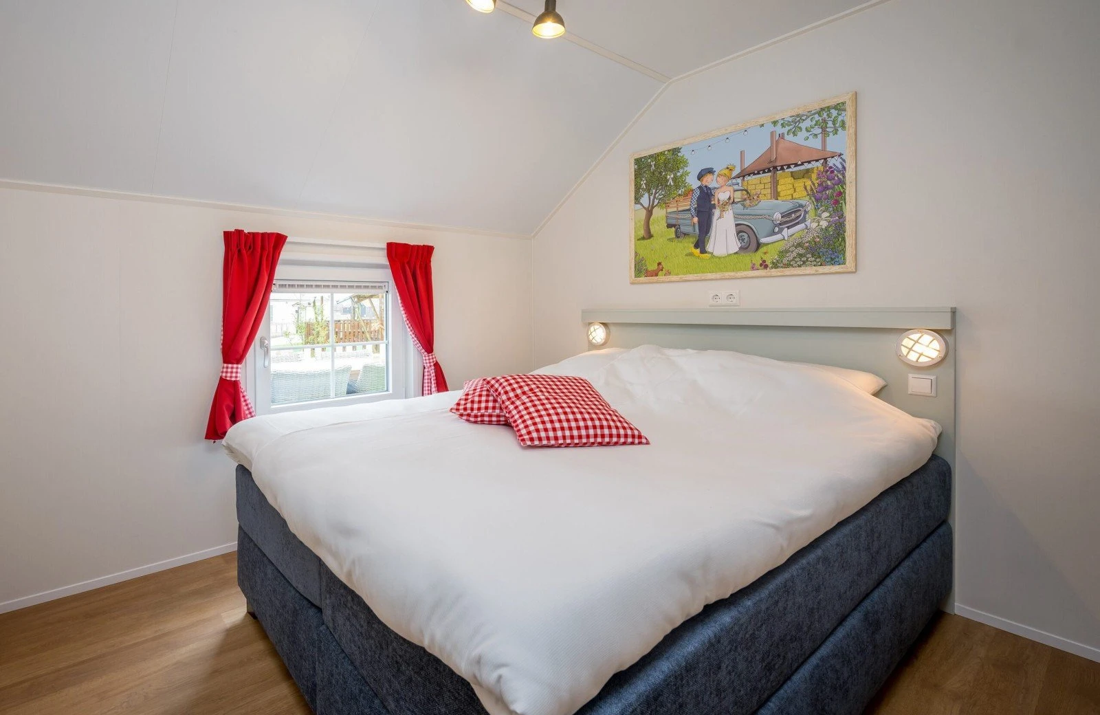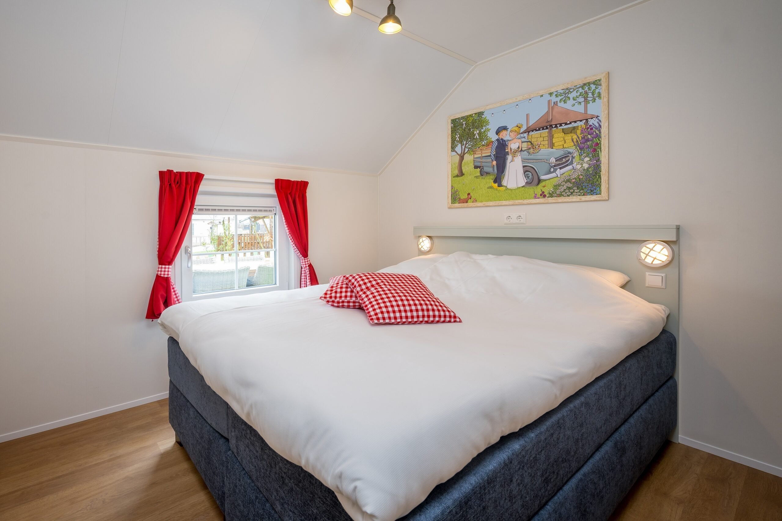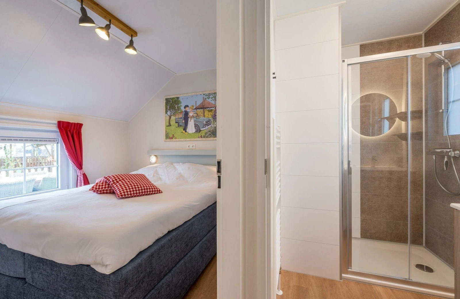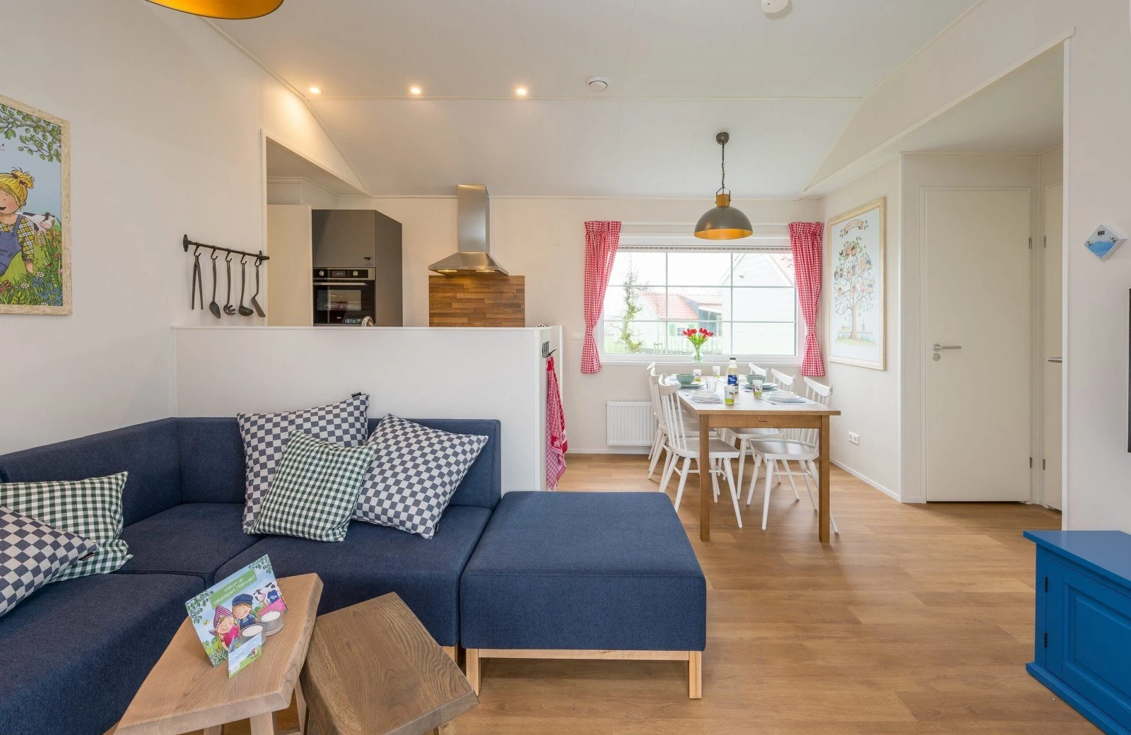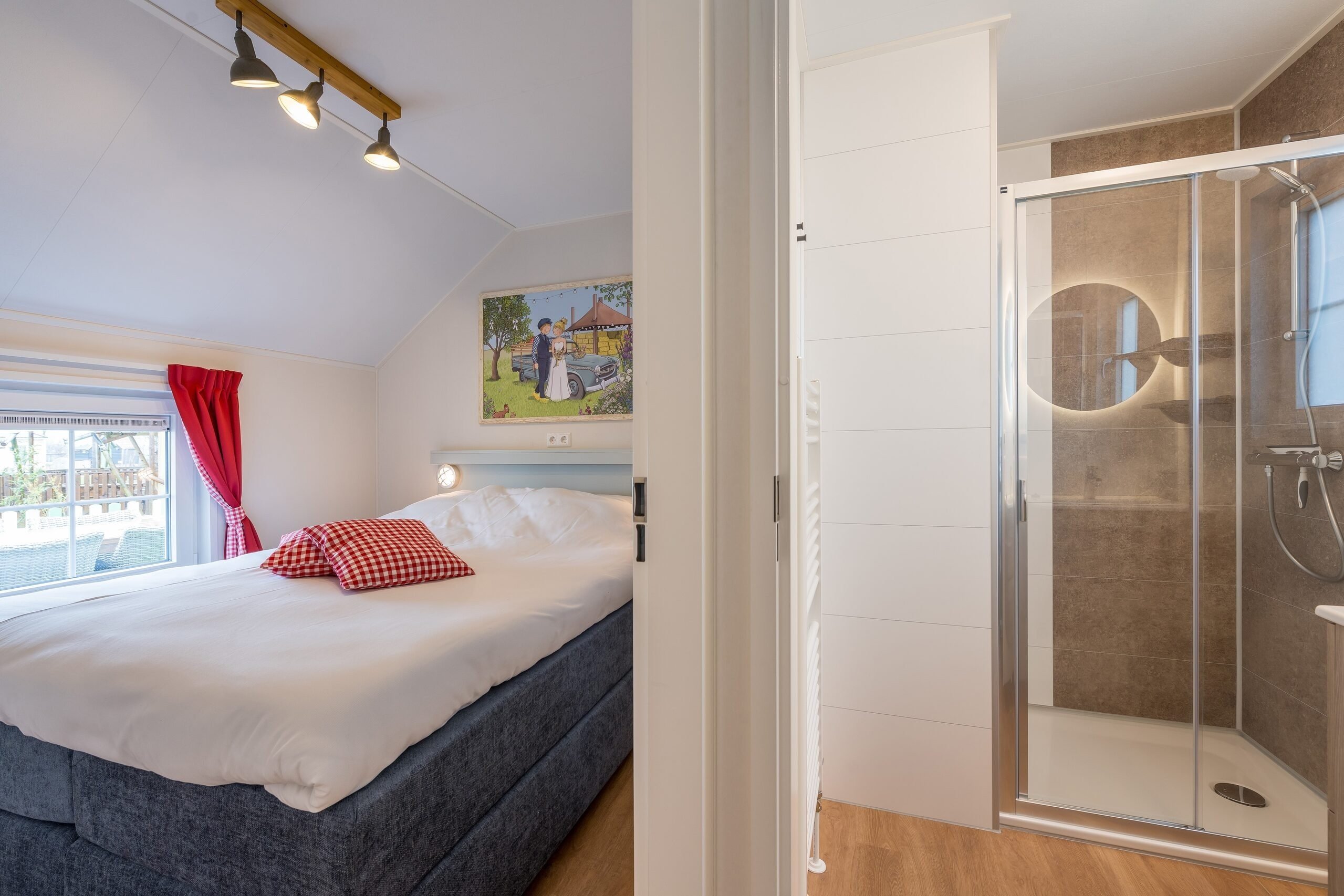 Het Luxe Fien & Teun boerderijtje beschikt over een woonkamer met een zit- en eethoek met airconditioning. De keuken is voorzien van onder andere een kookplaat, koelkast, vaatwasser en combimagnetron. Tijd om te gaan slapen? Dat kan in de drie slaapkamers, waarvan twee slaapkamers met comfortabele Swisse Sense bedden en een stapelbed. Ook is het Boerderijtje voorzien van een badkamer met douche en apart toilet.