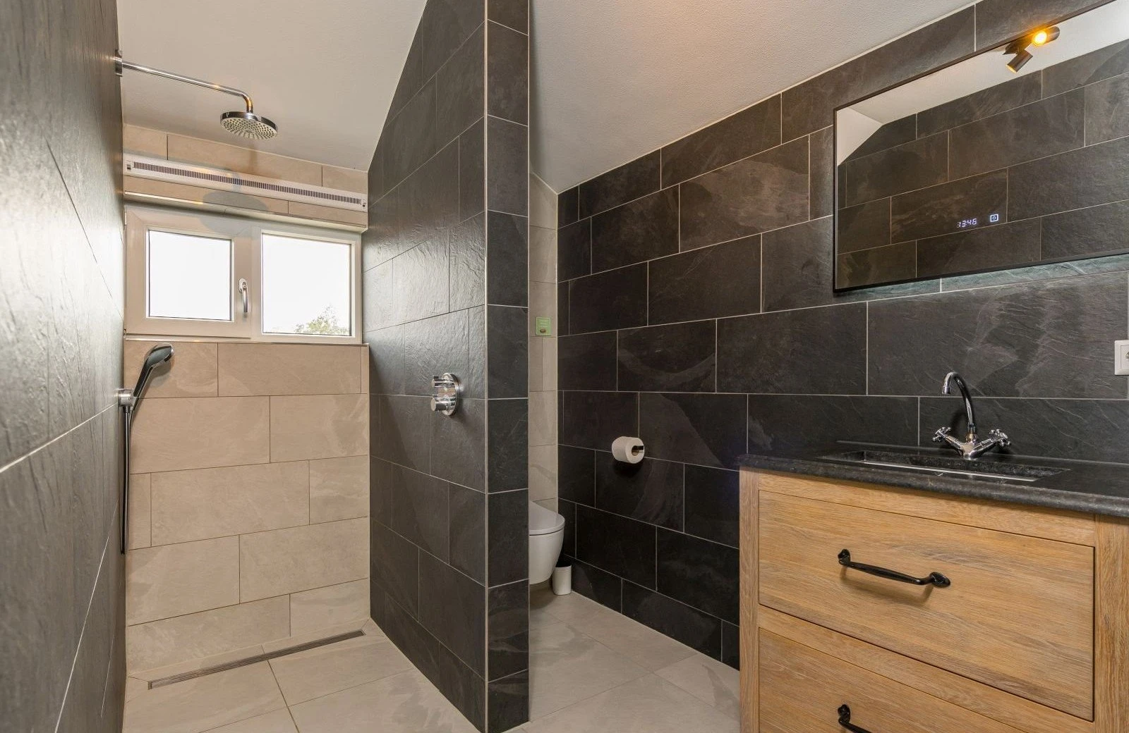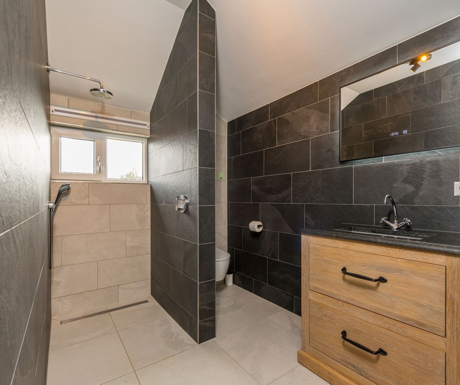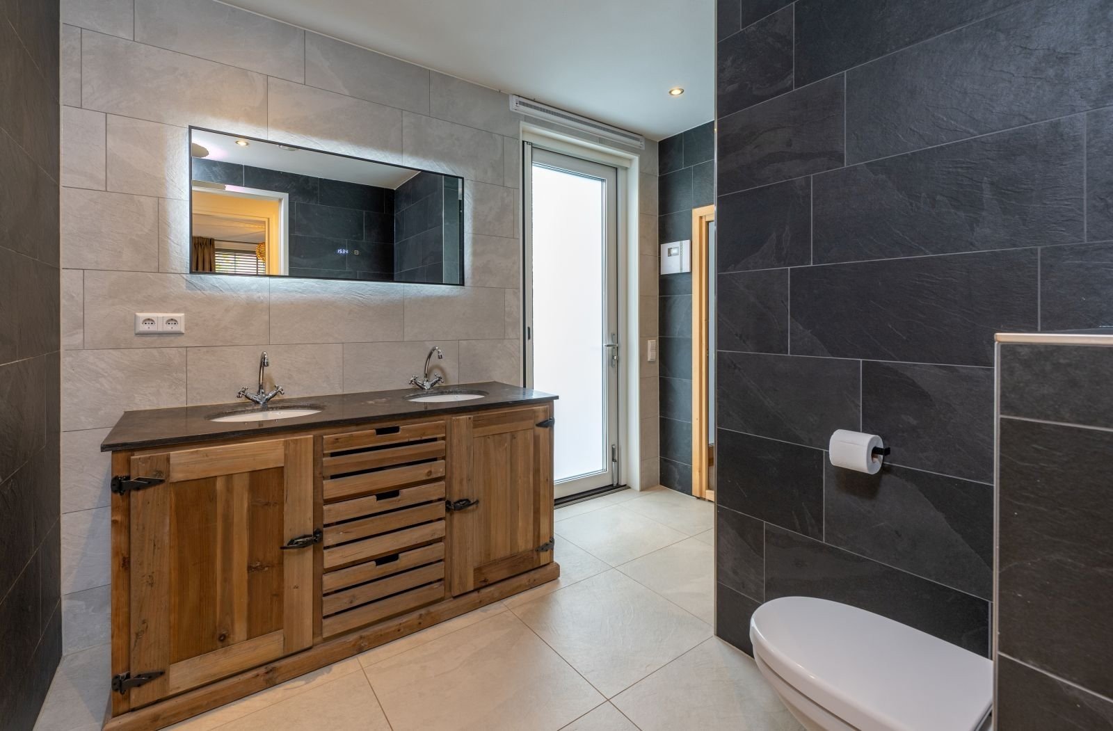 De Luxe Wellness Boerderij bevat drie badkamers, waarvan twee op de begane grond en één op de eerste verdieping. Alle badkamers zijn voorzien van een douche en wastafel. Één van de badkamers op de begane grond biedt directe toegang tot de sauna, jacuzzi en tuin. Naast het toilet in de badkamer boven en beneden, vind je op de begane grond ook nog een toilet los van de badkamer.