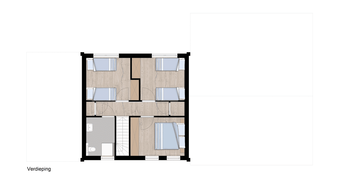 Op de eerste verdieping vind je nog drie slaapkamers, deze slaapkamers hebben onderstaande indeling: