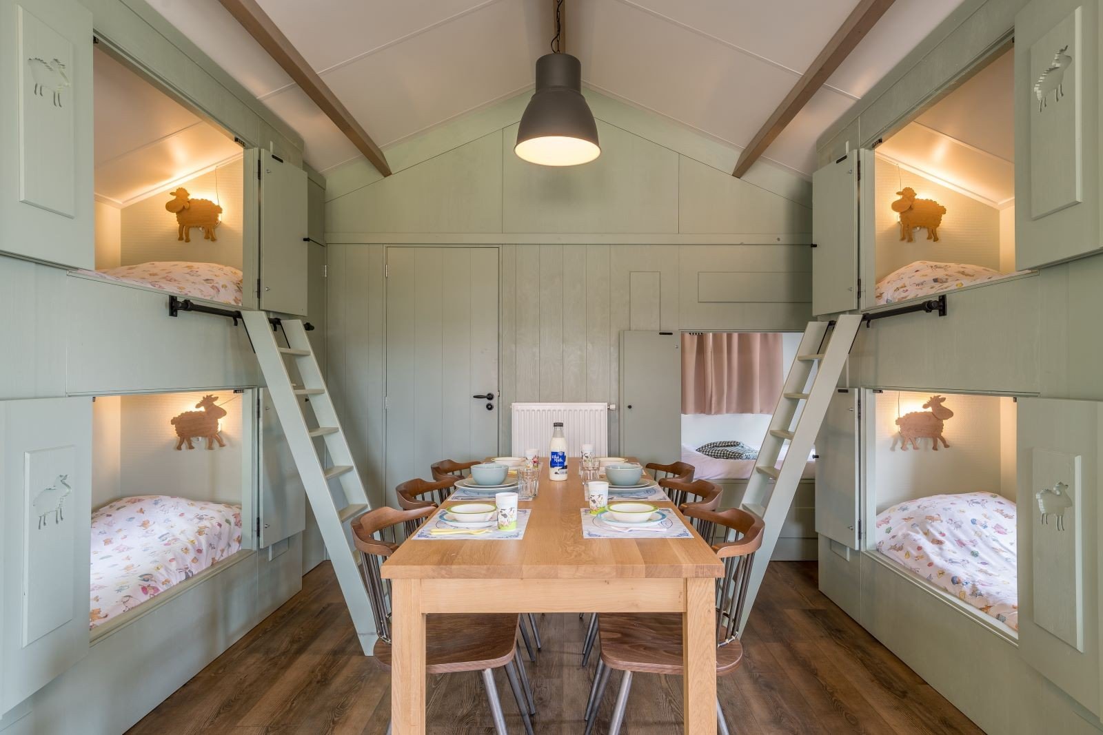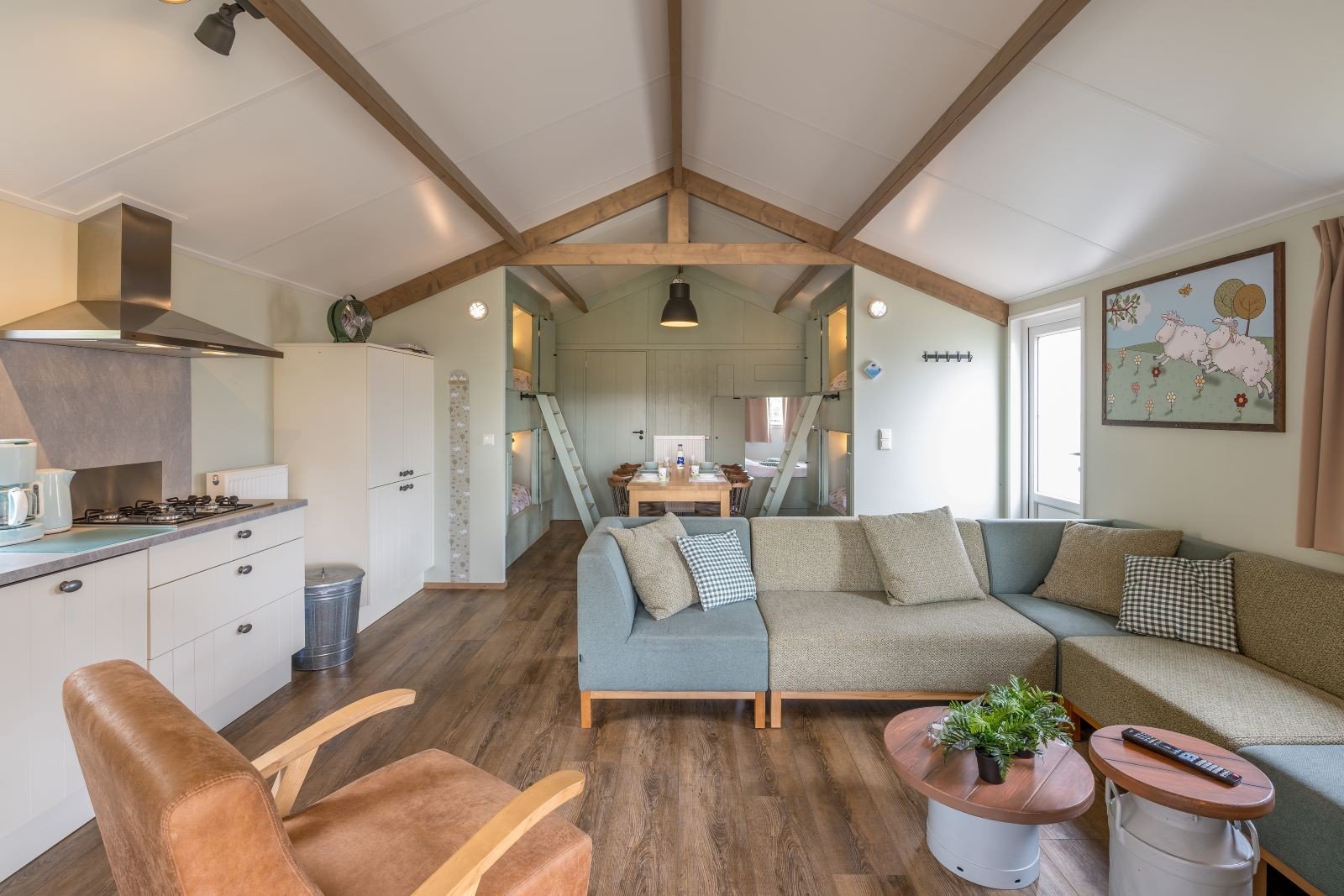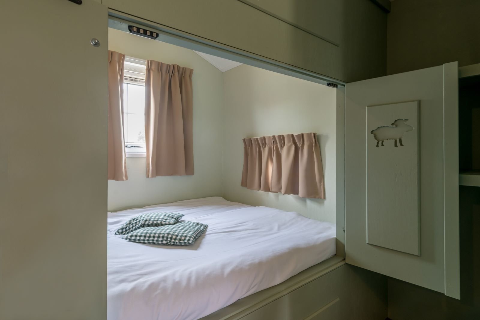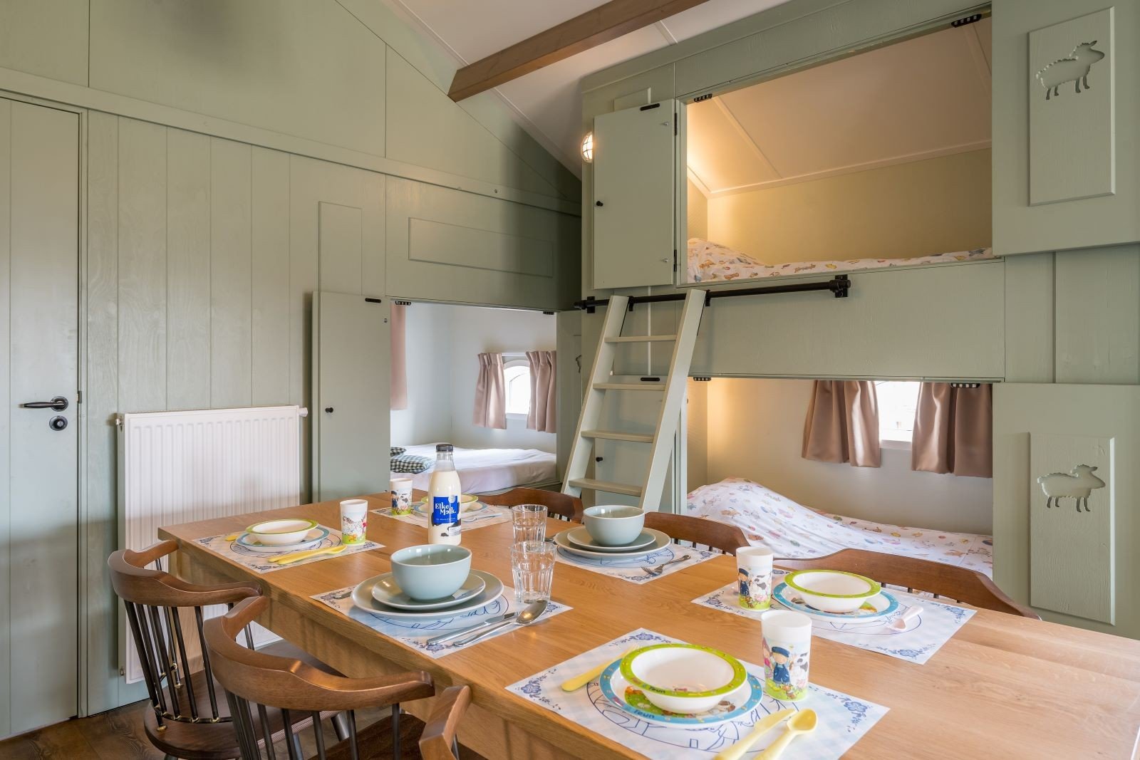 Deze unieke accommodatie is ideaal voor gezinnen met kinderen en beschikt over een woonkamer met zit- en eethoek. De keuken is voorzien van onder andere een kookplaat, koelkast, vaatwasser en combimagnetron. Ook zijn de Mike & Molly Schaapskooitjes voorzien van een badkamer met douche en toilet. In de Schaapskooitjes slaapt iedereen in een échte bedstede. Voor de kinderen zijn er twee stapelbedstedes en voor de ouders een tweepersoons bedstede.