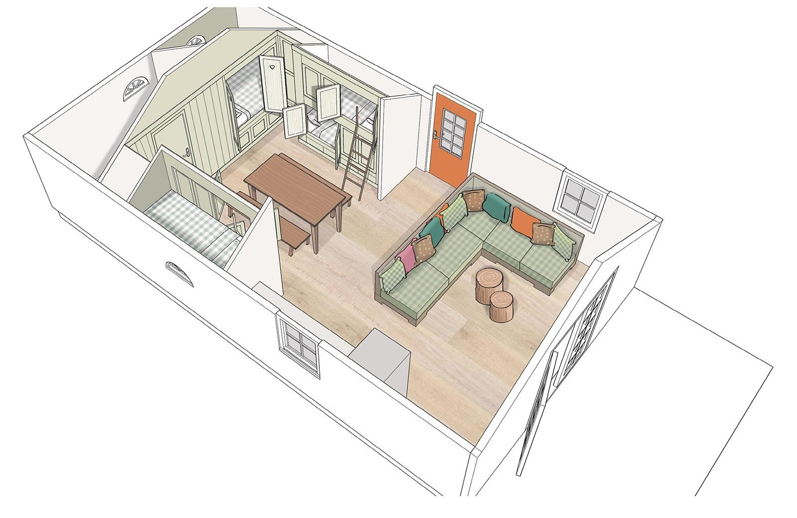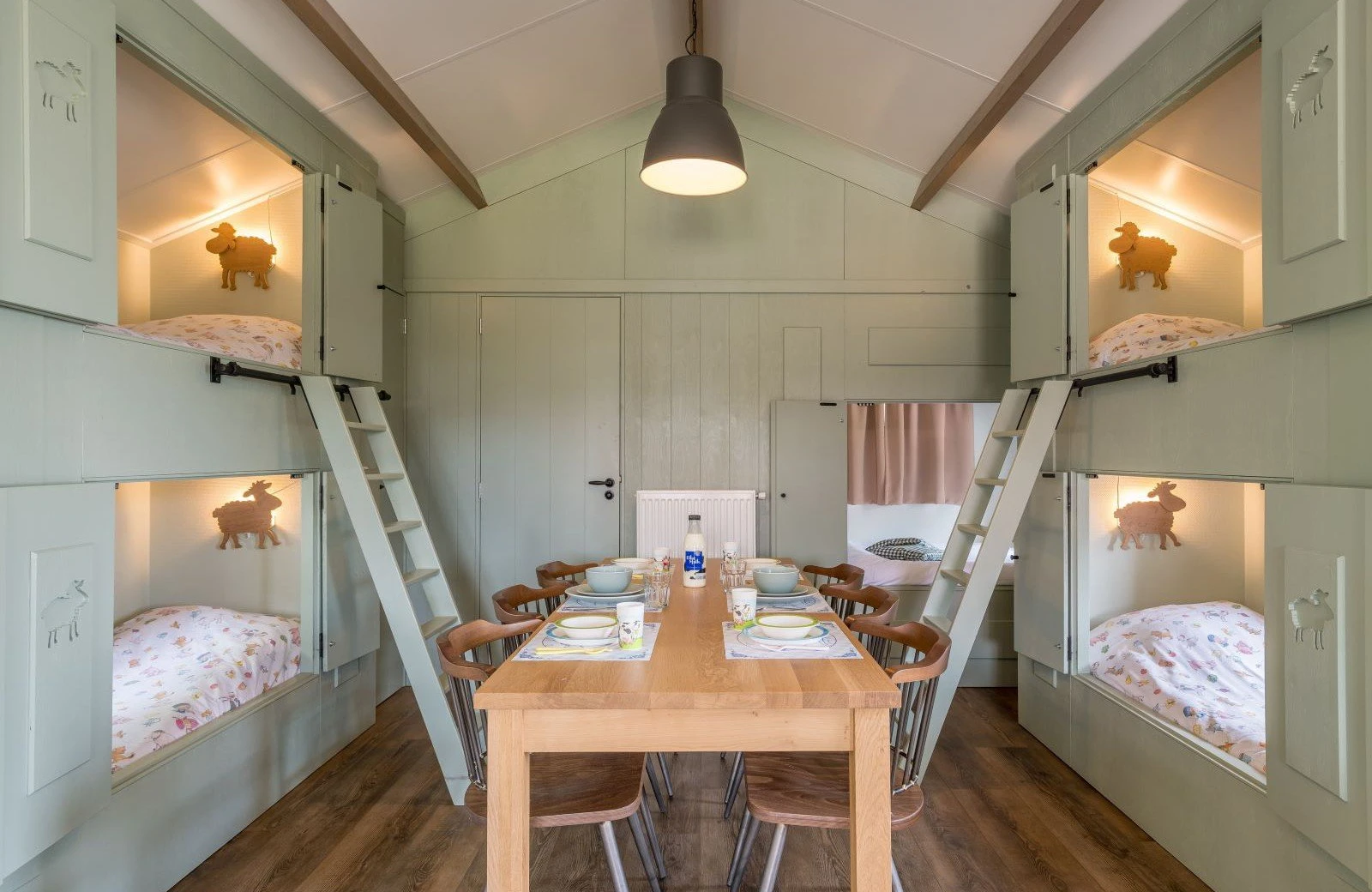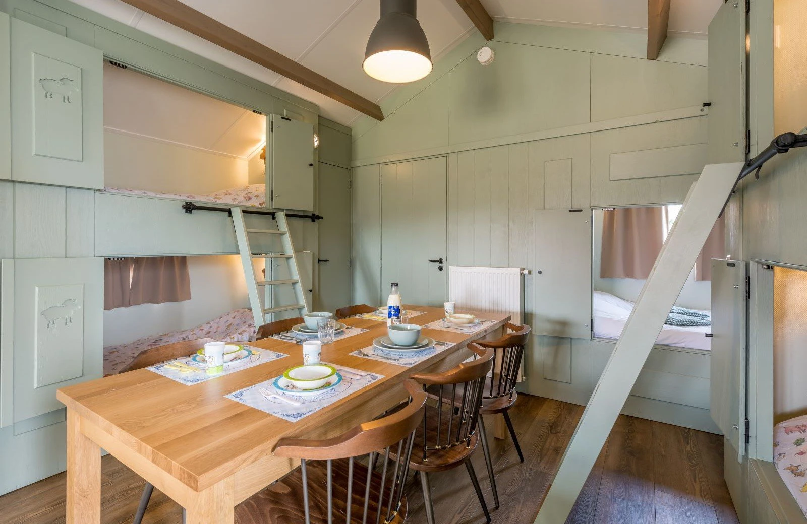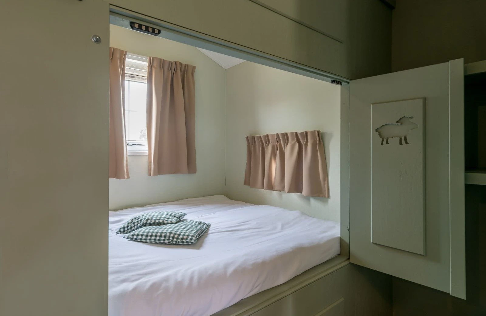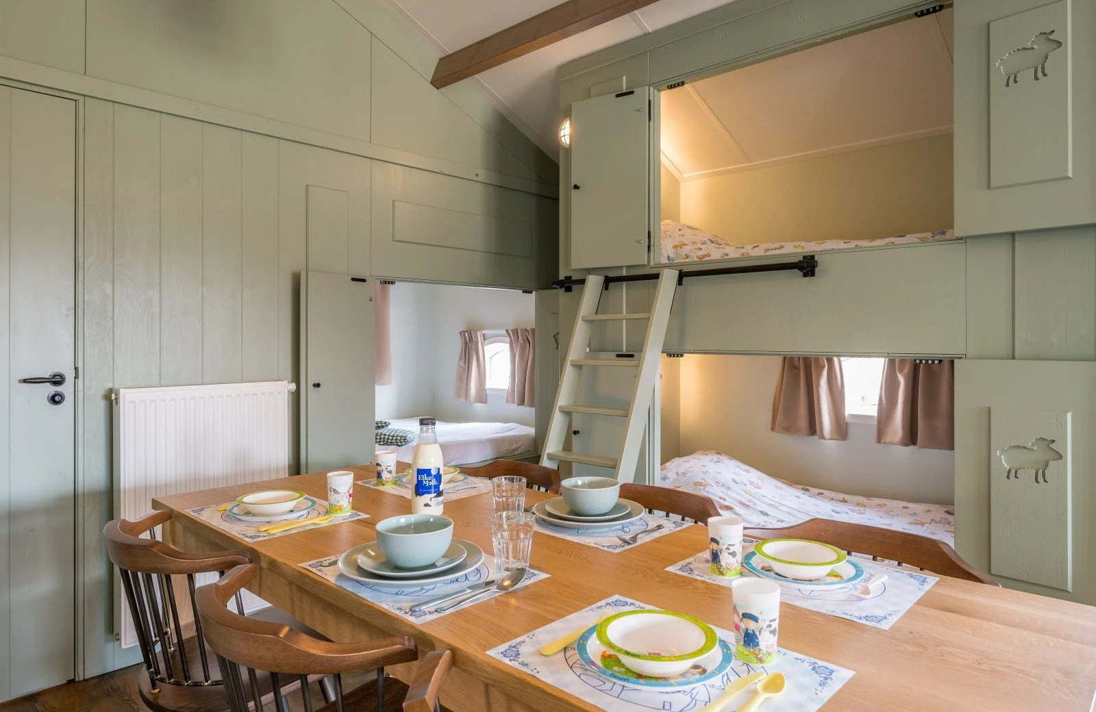 Deze unieke accommodatie is ideaal voor gezinnen met kinderen en beschikt over een woonkamer met zit- en eethoek. De keuken is voorzien van onder andere een kookplaat, koelkast, vaatwasser en combimagnetron. Ook zijn de Mike & Molly Schaapskooitjes voorzien van een badkamer met douche en toilet. In de Schaapskooitjes slaapt iedereen in een échte bedstede. Voor de kinderen zijn er twee stapelbedstedes en voor de ouders een tweepersoons bedstede.